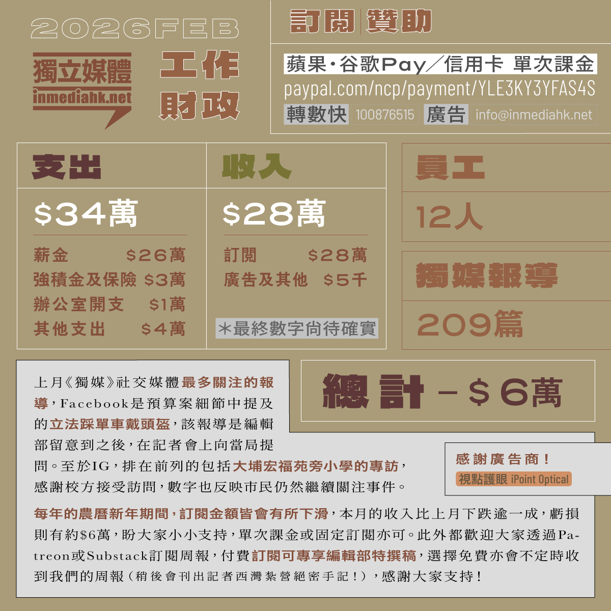 每年的農曆新年期間,訂閱金額皆會有所下滑,本月的收入比上月下跌逾一成,虧損則有約6萬,盼大家小小支持,單次課金或固定訂閱亦可。此外都歡迎大家透過Patreon或Substack訂閱周報,付費訂閱可專享編輯部特撰稿,選擇免費亦會不定時收到我們的周報(稍後會刊出記者西灣紮營絕密手記!),感謝大家支持!